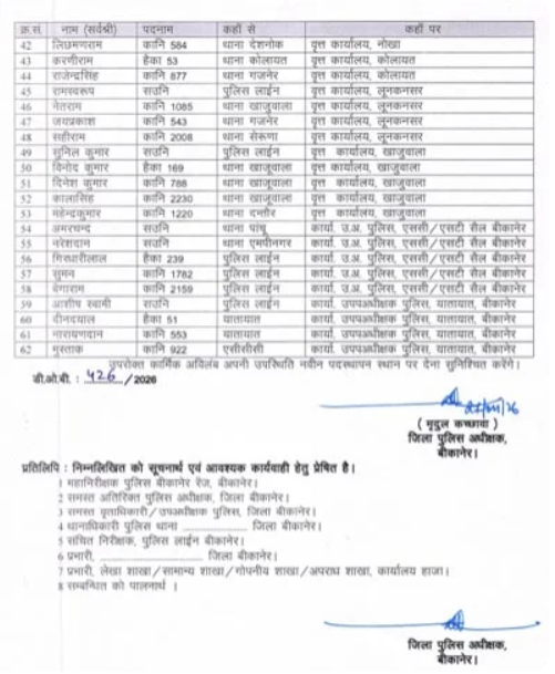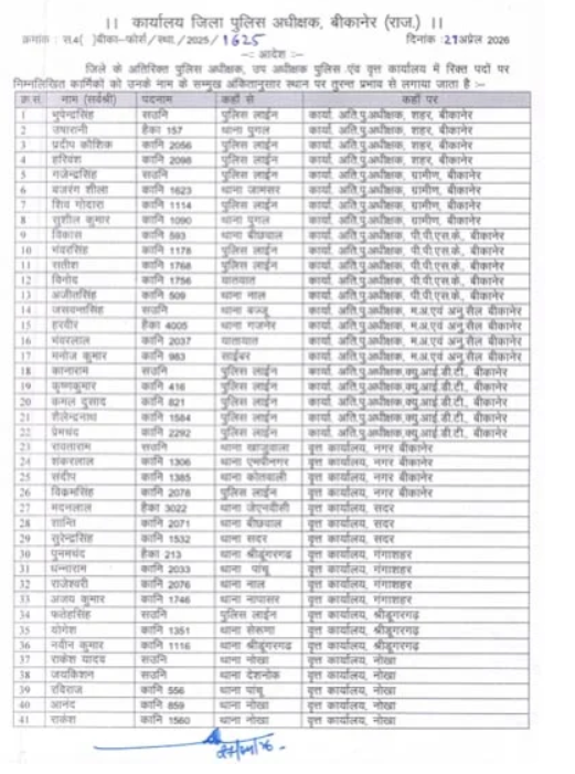 बीकानेर। जिले की कानून व्यवस्था को और अधिक सुचारू और प्रभावी बनाने के उद्देश्य से बीकानेर पुलिस महकमे में एक बड़ा प्रशासनिक फेरबदल किया गया है। पुलिस अधीक्षक (SP) मृदुल कच्छावा ने देर रात एक आदेश जारी करते हुए 62 पुलिसकर्मियों को इधर-उधर किया है। **ग़ौरतलब है** कि लंबे समय से रिक्त चल रहे पदों और विभागीय आवश्यकताओं को ध्यान में रखते हुए यह सूची तैयार की गई है।