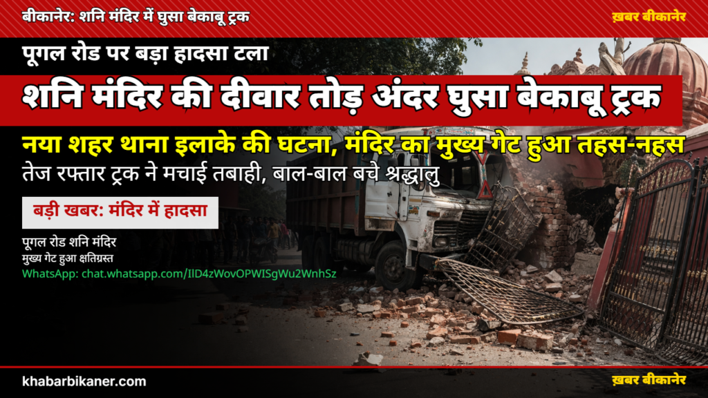 बीकानेर में बड़ा हादसा टला: पूगल रोड स्थित ‘शनि मंदिर’ में घुसा बेकाबू ट्रक, मुख्य गेट और दीवारें चकनाचूर, बाल-बाल बचे श्रद्धालु! April 4, 2026