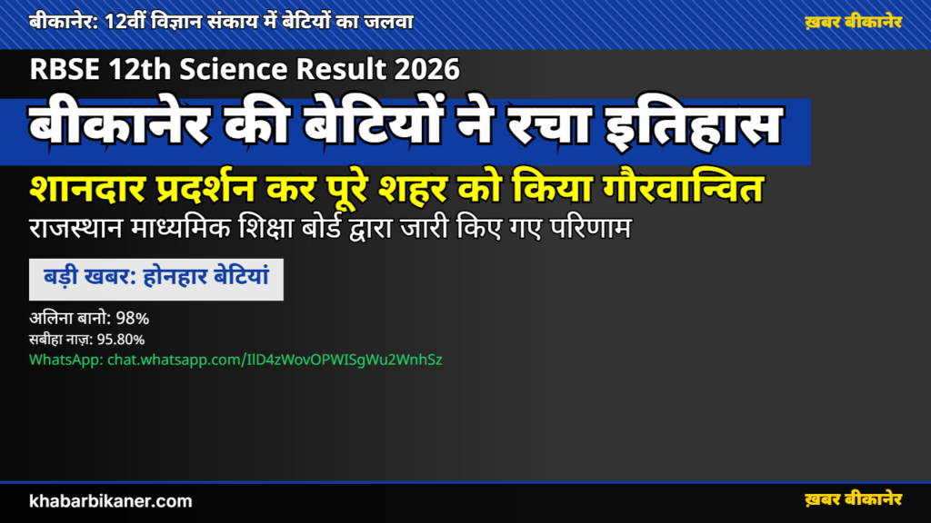 बीकानेर की बेटियों का कमाल: 12वीं साइंस बोर्ड में सबीहा नाज़ (95.80%) और अलिना बानो (98%) ने गाड़े सफलता के झंडे, परिवार और समाज का नाम किया रोशन! March 31, 2026