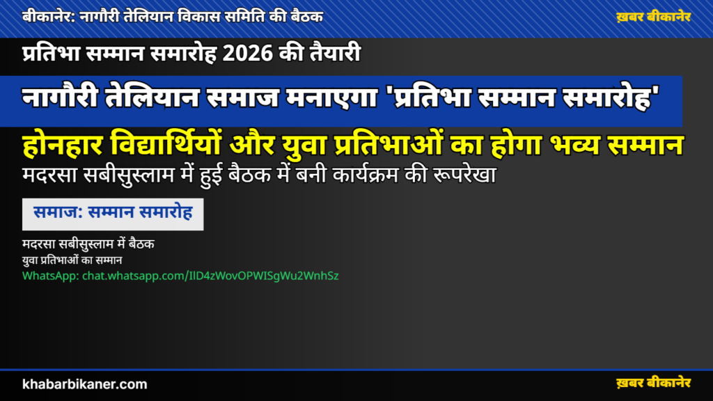 बीकानेर: नागौरी तेलियान विकास समिति अगस्त में करेगी ‘प्रतिभा सम्मान समारोह 2026’, होनहार विद्यार्थियों, खिलाड़ियों और होनहारों का होगा सम्मान! March 31, 2026
