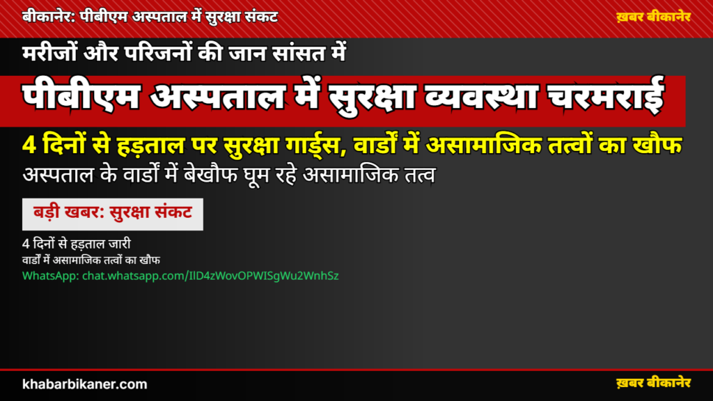 बीकानेर PBM अस्पताल की सुरक्षा ‘भगवान भरोसे’: 4 दिन से हड़ताल पर बैठे गार्ड, वार्डों में बेखौफ घूम रहे असामाजिक तत्व, मरीज़ और तीमारदार परेशान! (देखें Video) April 1, 2026