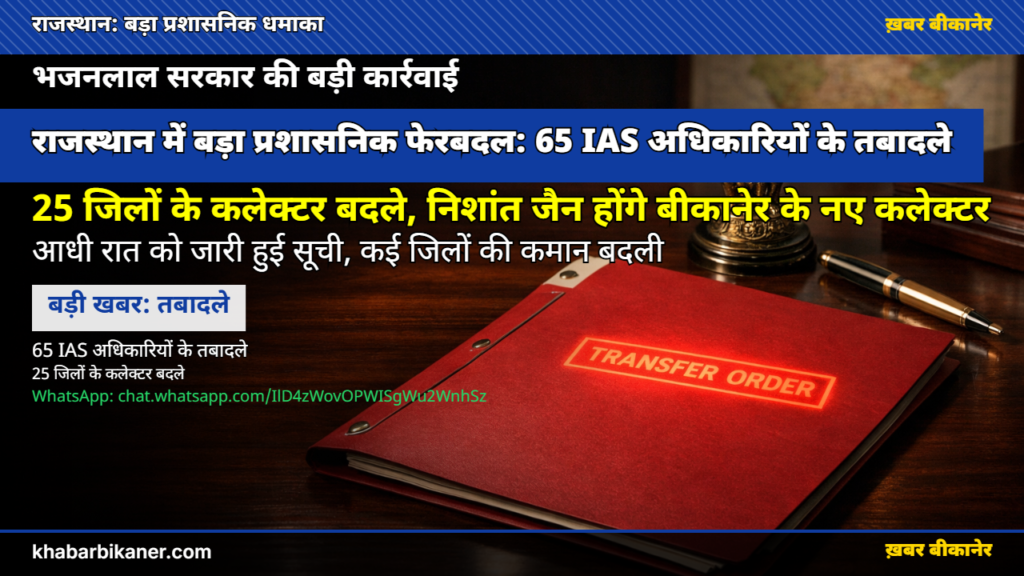 राजस्थान में आधी रात बड़ा प्रशासनिक फेरबदल: भजनलाल सरकार ने 65 IAS अफसरों के किए तबादले, बीकानेर को मिले नए कलेक्टर ‘निशांत जैन’ April 1, 2026