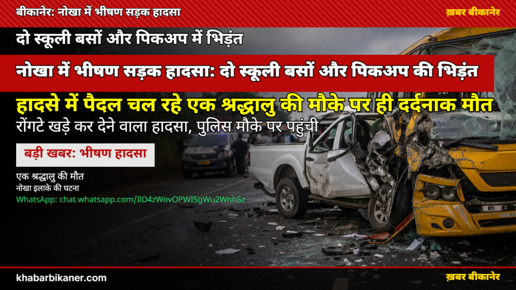 बीकानेर: नोखा में बड़ा सड़क हादसा: 2 स्कूली बसों और पिकअप में हुई जोरदार टक्कर, पैदल जा रहे श्रद्धालु की दर्दनाक मौत, 6 लोग घायल! April 2, 2026