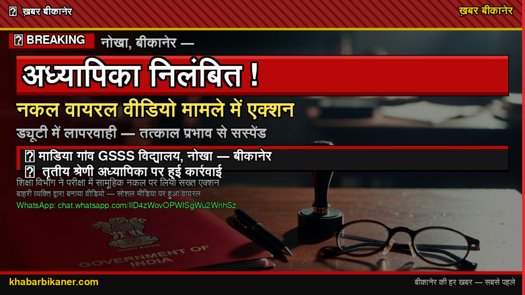 बीकानेर: नोखा के माडिया स्कूल नकल मामले में सख्त कार्रवाई — बाहरी व्यक्ति के वीडियो वायरल होने पर शिक्षिका निलंबित March 18, 2026