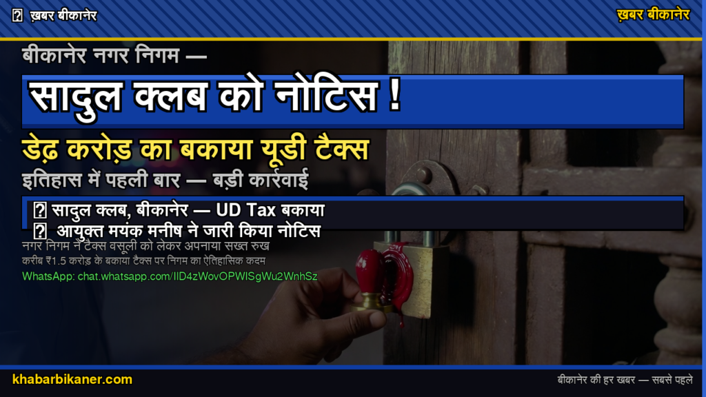 बीकानेर: नगर निगम का सख्त एक्शन — सादुल क्लब को ₹1.5 करोड़ UD टैक्स नोटिस, BKESL पर भी उठे सवाल March 18, 2026