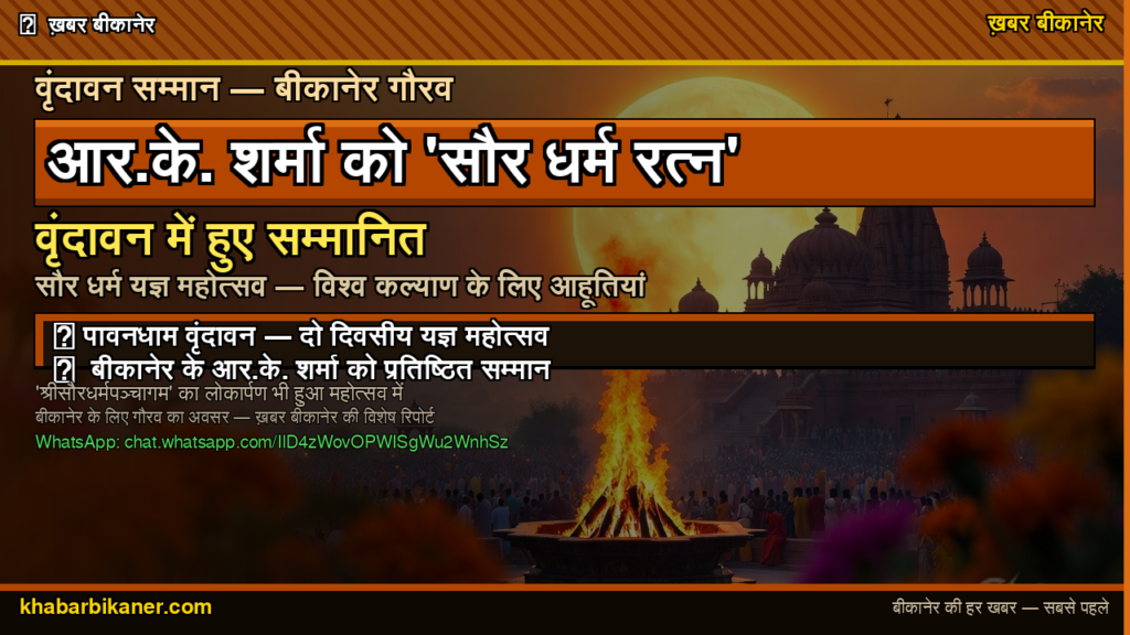 बीकानेर के आर.के. शर्मा को ‘पावनधाम वृंदावन’ में सौर धर्म यज्ञ महोत्सव के दौरान प्रतिष्ठित “सौर धर्म रत्न” सम्मान March 18, 2026