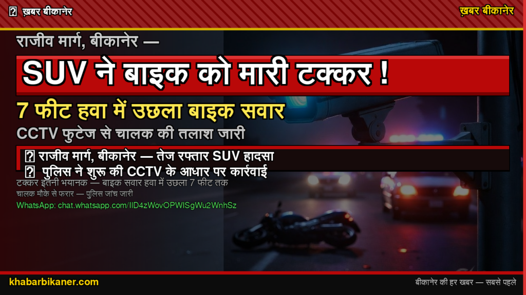 बीकानेर: राजीव मार्ग पर तेज रफ्तार SUV की टक्कर — बाइक सवार 7 फीट उछला, CCTV के आधार पर चालक की तलाश March 18, 2026