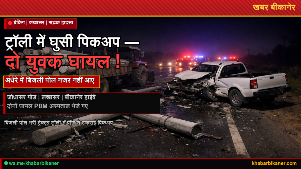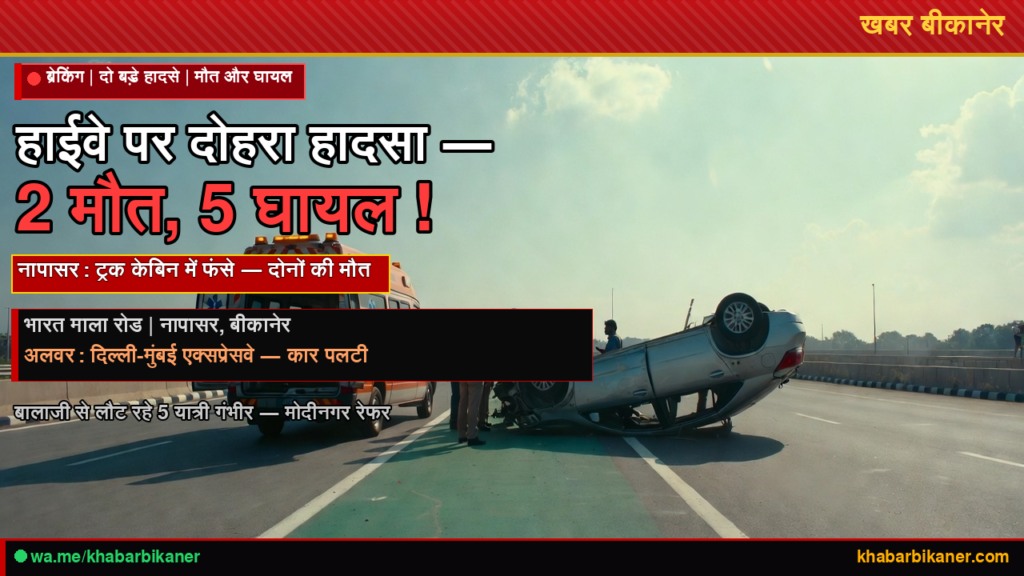 बीकानेर: नापासर में भारत माला सड़क पर भीषण ट्रक हादसा — दो की मौत; अलवर एक्सप्रेसवे पर कार पलटी, पाँच यात्री गंभीर March 16, 2026