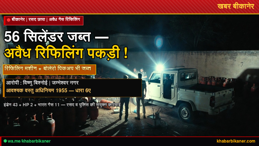 बीकानेर: जम्भेश्वर नगर में बड़ा LPG रैकेट पकड़ा — 56 सिलेंडर, रिफिलिंग मशीन और बोलेरो पिकअप जब्त; आरोपी की पहचान March 15, 2026