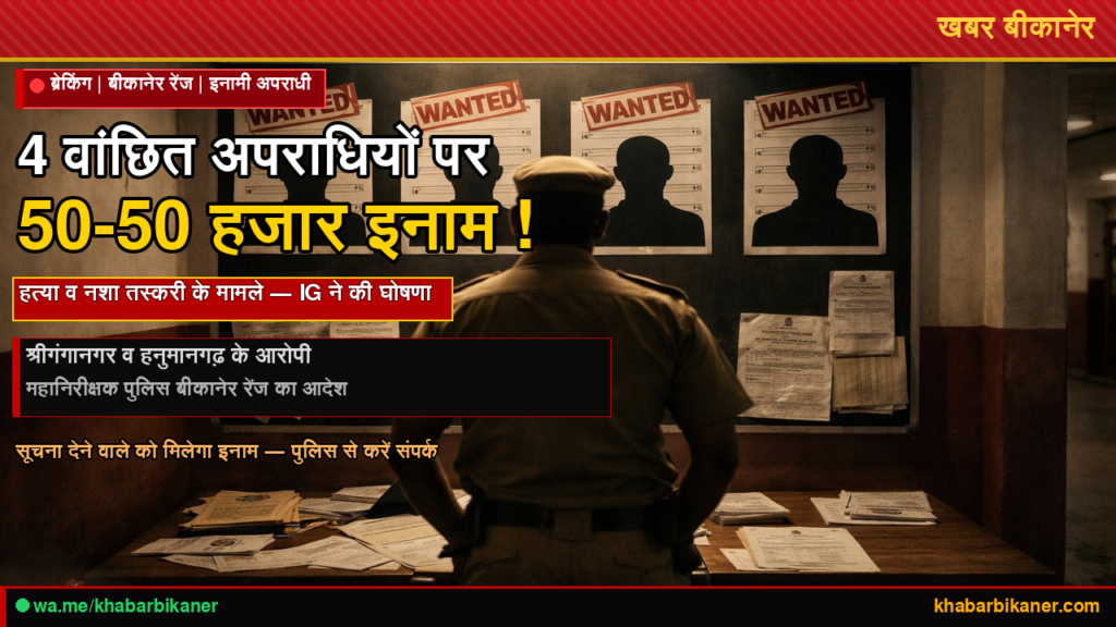 बीकानेर रेंज में बड़ा खुलासा: हत्या व ड्रग तस्करी के 4 कुख्यात आरोपी वांछित — 50-50 हजार का इनाम घोषित March 11, 2026