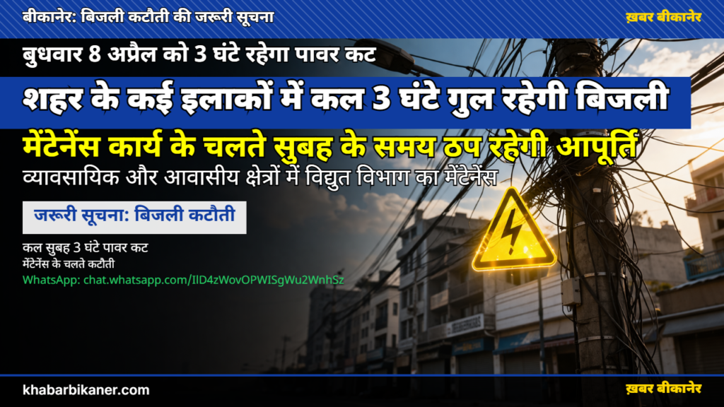 बीकानेर वासियों के लिए अलर्ट: बुधवार को इन बड़े इलाकों में लगातार 3 घंटे गुल रहेगी बिजली, देखें ‘पावर-कट’ वाले क्षेत्रों की पूरी लिस्ट! April 7, 2026