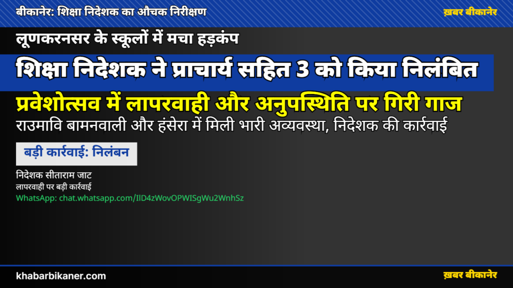 बीकानेर: शिक्षा निदेशक सीताराम जाट का बड़ा ‘एक्शन’, लूणकरनसर के सरकारी स्कूलों में मारा छापा; बिना बताए गायब मिले टीचर और लापरवाह प्राचार्य को किया सस्पेंड! April 8, 2026