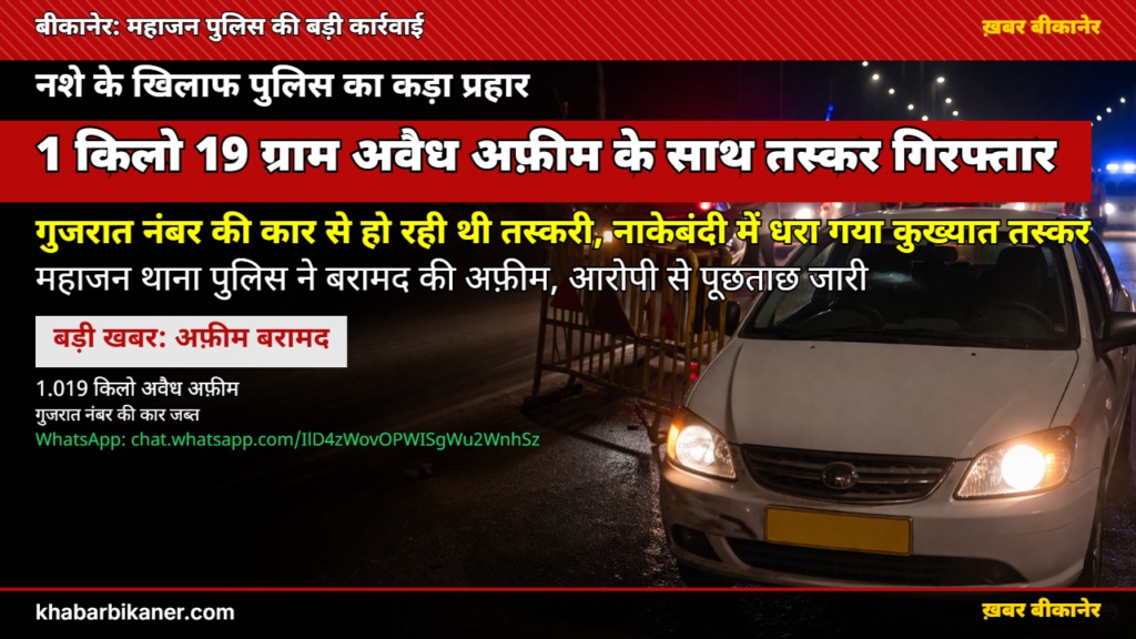 बीकानेर: महाजन पुलिस का बड़ा ‘ऑपरेशन’, नाकेबंदी के दौरान 1 किलो 19 ग्राम अफ़ीम के साथ तस्कर गिरफ्तार, गुजरात नंबर की कार ज़ब्त! April 5, 2026