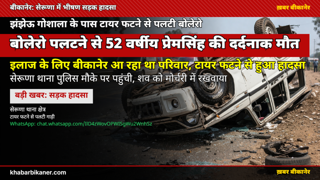 बीकानेर: इलाज के लिए जा रहे परिवार की बोलेरो का ‘झंझेऊ गोशाला’ के पास फटा टायर, गाड़ी पलटने से 52 वर्षीय प्रेमसिंह की दर्दनाक मौत! April 7, 2026