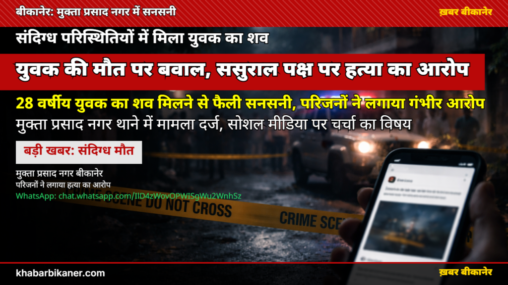 बीकानेर में 28 वर्षीय युवक की संदिग्ध हालात में मौत: परिजनों का आरोप— “ससुराल वालों ने की है हत्या,” सोशल मीडिया पर भी मामला हुआ वायरल! April 11, 2026