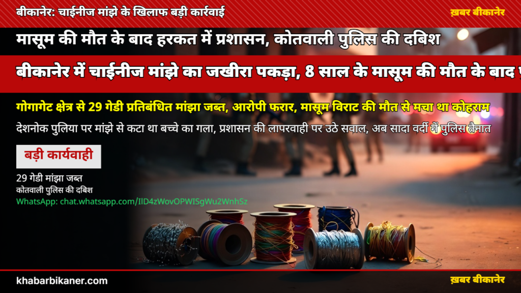 बीकानेर: देशनोक में चाइनीज़ मांझे से कटा 8 साल के मासूम का गला, मौके पर ही दर्दनाक मौत, जाग उठी पुलिस ने ‘लाल गुफा रोड’ पर मारा छापा, 29 चरखी मौत का सामान ज़ब्त! April 18, 2026