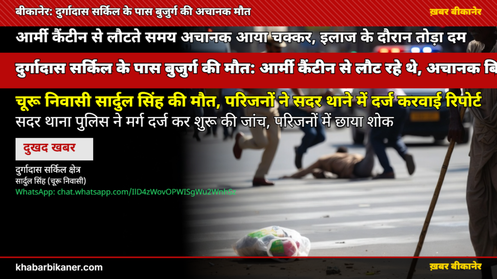 बीकानेर में दुखद हादसा: आर्मी कैंटीन से सामान लेकर लौट रहे 72 वर्षीय बुजुर्ग को दुर्गादास सर्किल पर आया चक्कर, अस्पताल में तोड़ा दम! April 18, 2026